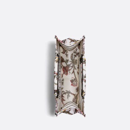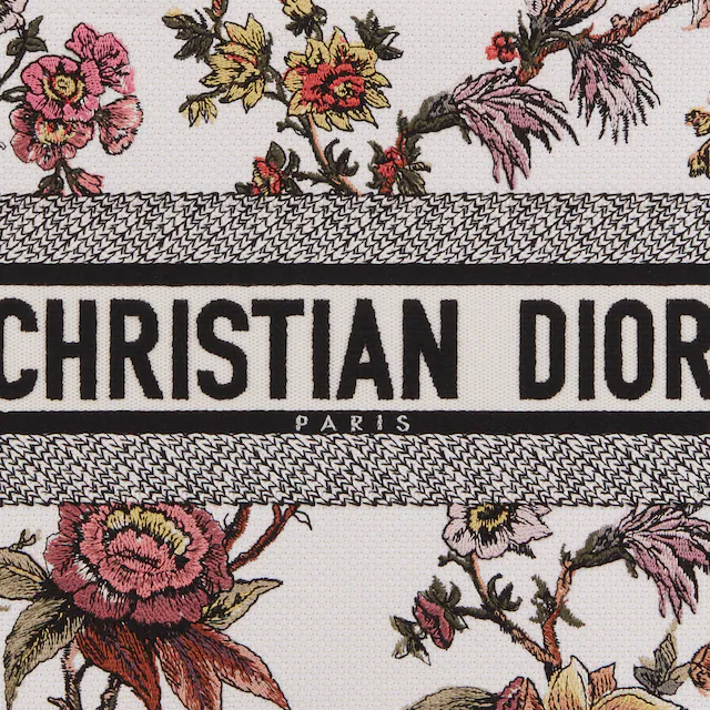 The Book Tote is an original creation introduced by Maria Grazia Chiuri, 's Creative Director, and has become a staple of the aesthetic. Designed to hold all the daily essentials, it is fully embroidered with the white multicolor Jardin Botanique motif and presents a romantic floral pattern inspired by Mr. 's beloved Granville gardens. Adorned with the Christian Paris signature on the front, the medium tote exemplifies the House's signature savoir-faire and may be carried by hand or worn over the shoulder.
