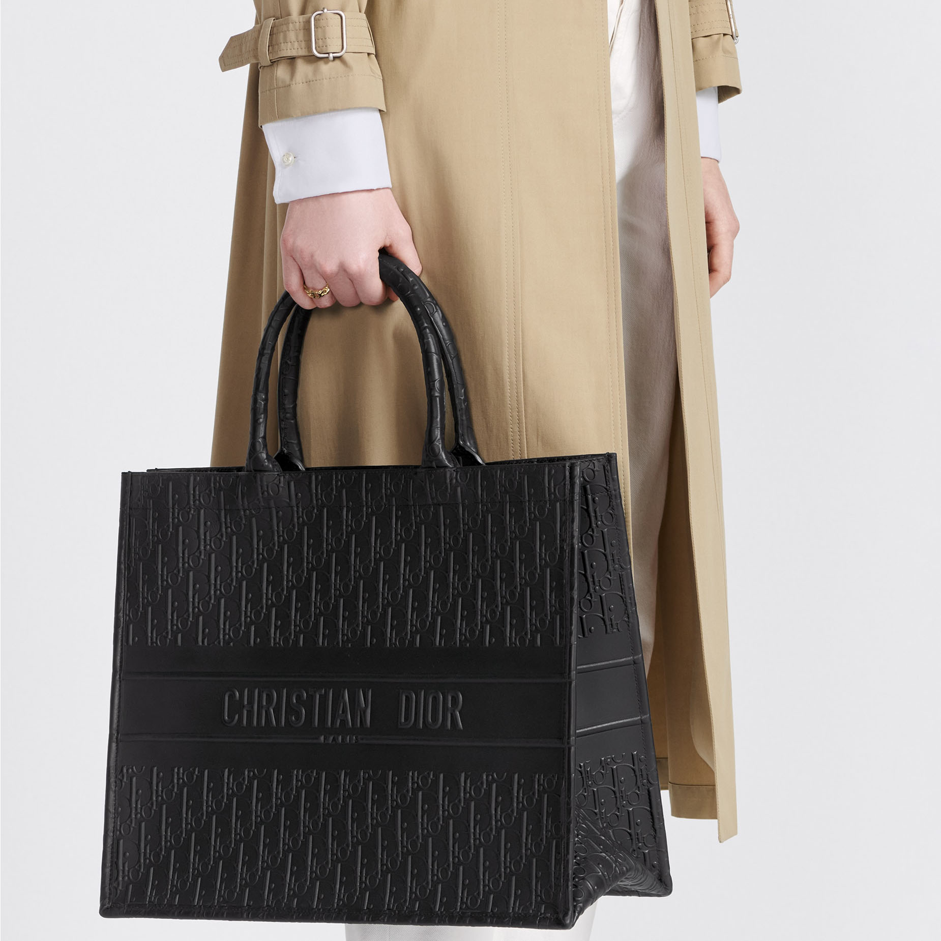 Introduced by Maria Grazia Chiuri, Creative Director of Christian , the Book Tote has become a staple of the aesthetic. Designed to hold all the daily essentials, the black calfskin style is embossed with a Oblique motif and is further enhanced by the Christian Paris signature on the front. The large tote exemplifies the House's signature savoir-faire and may be carried by hand or worn over the shoulder.