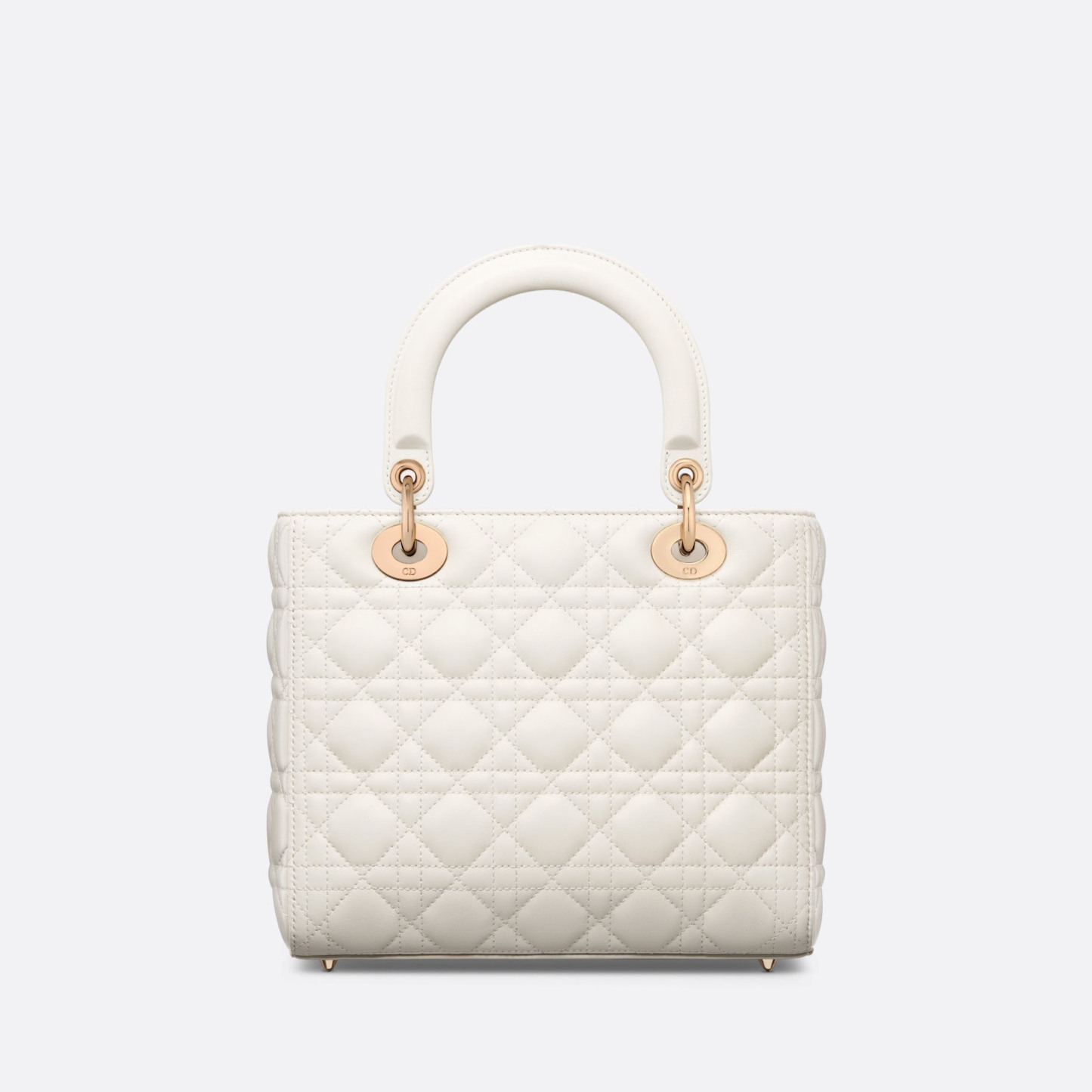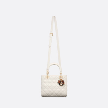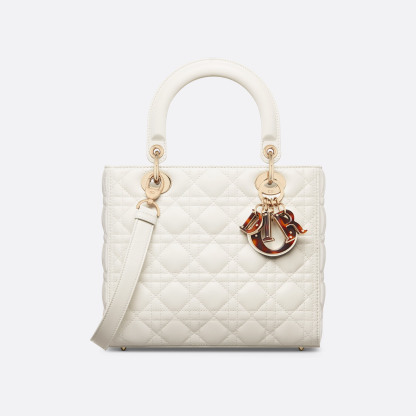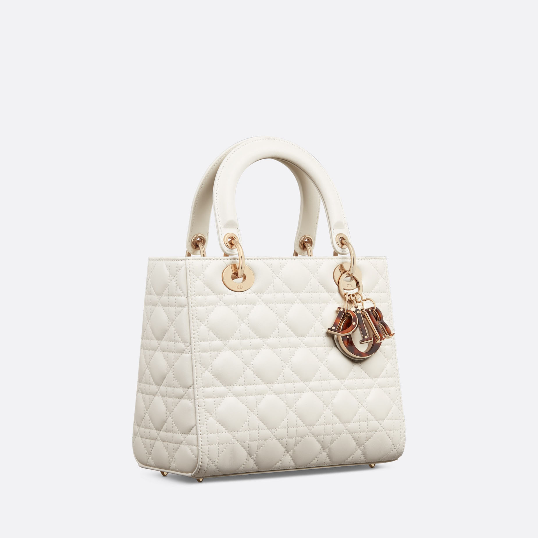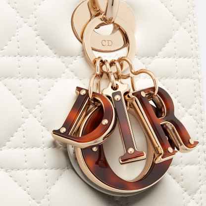 The Lady bag epitomizes the House's vision of elegance and beauty. Sleek and refined, the style is timeless. Crafted in latte lambskin with Cannage stitching, its supreme quilting instantly stands out, while the pale gold-finish metal and brown tortoiseshell-effect resin D.I.O.R. charms offer an elegant appeal. Featuring a thin, removable leather shoulder strap, the medium Lady bag can be carried by hand or worn crossbody.