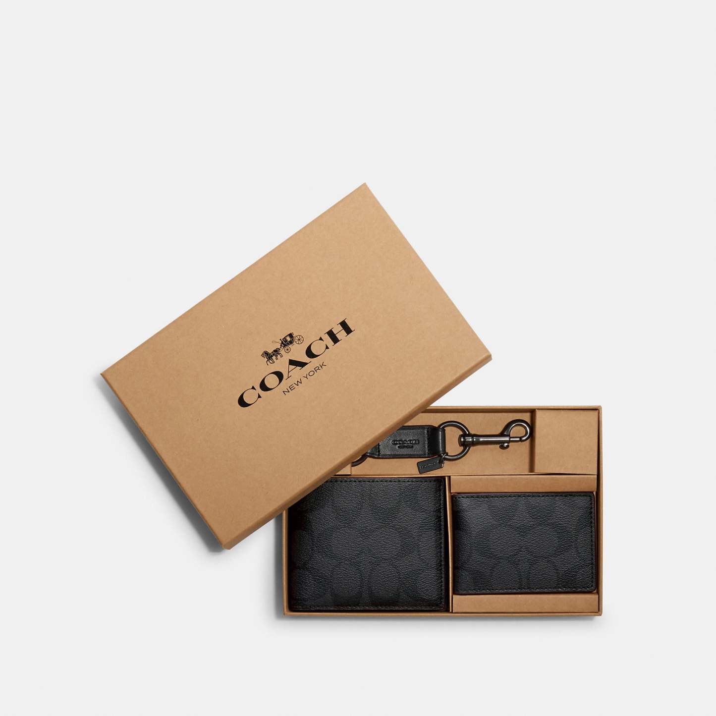 Signature coated canvas Eight credit card slots Full-length bill compartments Removable insert with ID window and two credit card slots 4 1/4 (L) x 3 3/4 (H) x 3/4 (W) Trigger valet key fob included Packaged in a gift box Style No. 41346 | Outlet Boxed 3 In 1 Wallet Gift Set In Signature Canvas - Multi