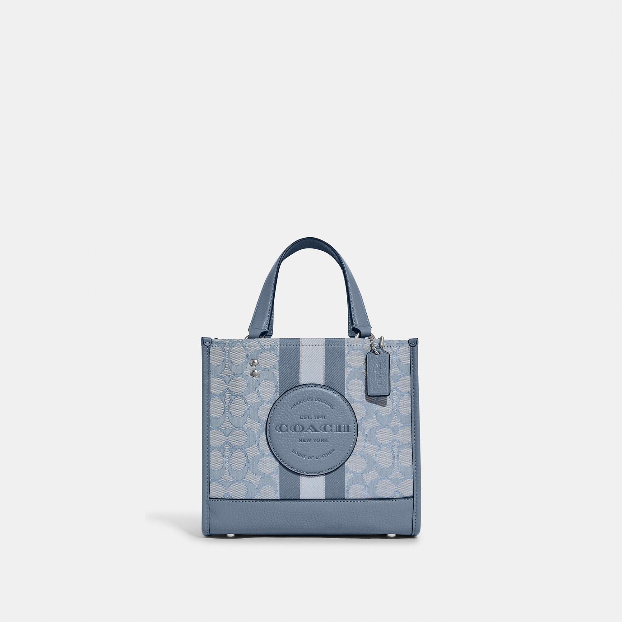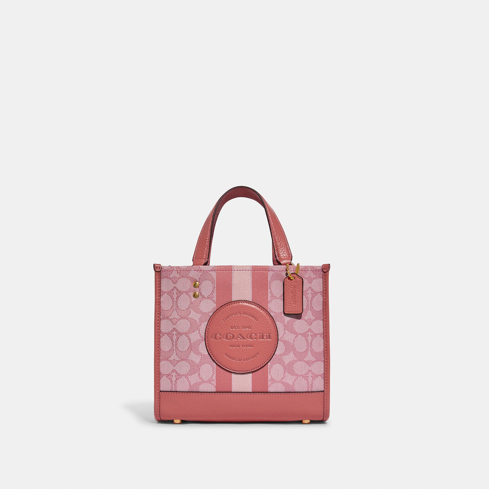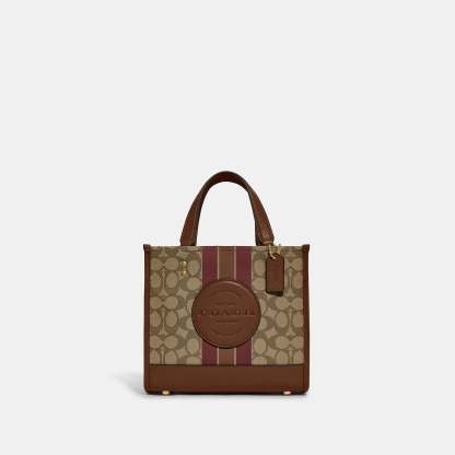 Signature jacquard and refined pebble leather Inside zip and multifunction pockets Snap closure fabric lining Handles with 4 1/4 drop Detachable strap with 22 1/2 drop for shoulder or crossbody wear Four protective feet at base 8 3/4 (L) x 7 3/4 (H) x 4 1/4 (W) This piece is crafted of our Signature jacquard made from a blend of organic cotton and recycled polyester Style No. C8417 | Outlet Dempsey Tote 22 In Signature Jacquard With Stripe And Patch - Red