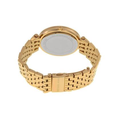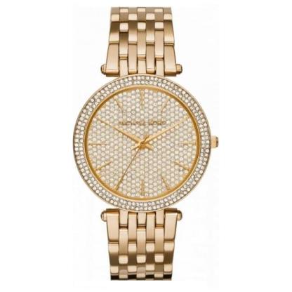 Combining a glamorous gold-tone bracelet with a sparkling pave crystal topring and dial, the Darci watch is an elegant mix of style and function. It also comes with a gold-tone_stainless steel case and fixed gold-tone bezel set with crystals._ Quartz movement. Scratch-resistant mineral crystal. Pull/push crown. Solid case back. Case thickness: 7 mm. Round case shape. Deployment clasp. Dress watch style.