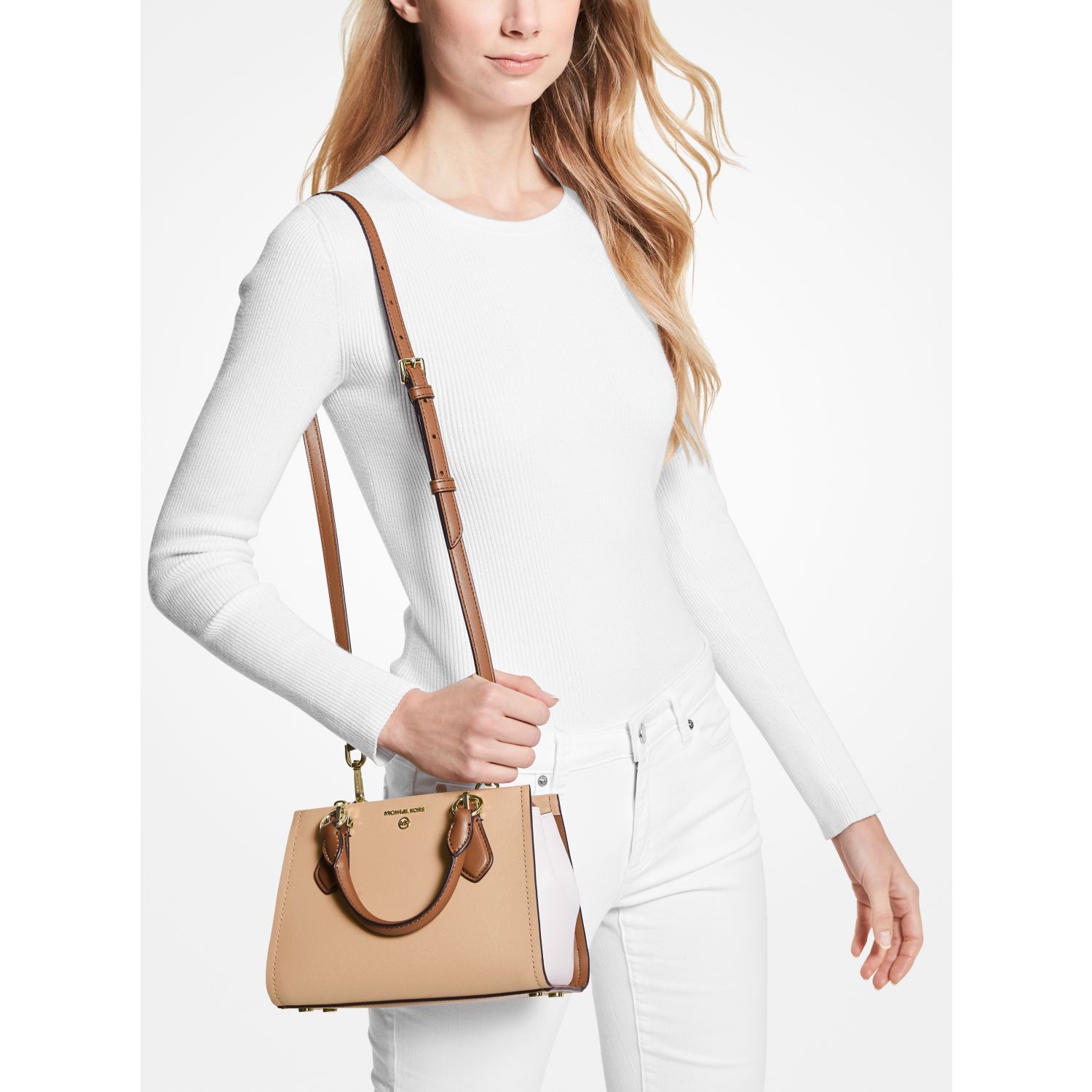 Our Marilyn crossbody bag will top off any look with polished charm. Rendered in Saffiano leather with a color-blocked finish, it features sleek accordion sides, an array of pockets and a snap closure to keep your essentials secure. Style it with the season’s ultra-feminine looks.