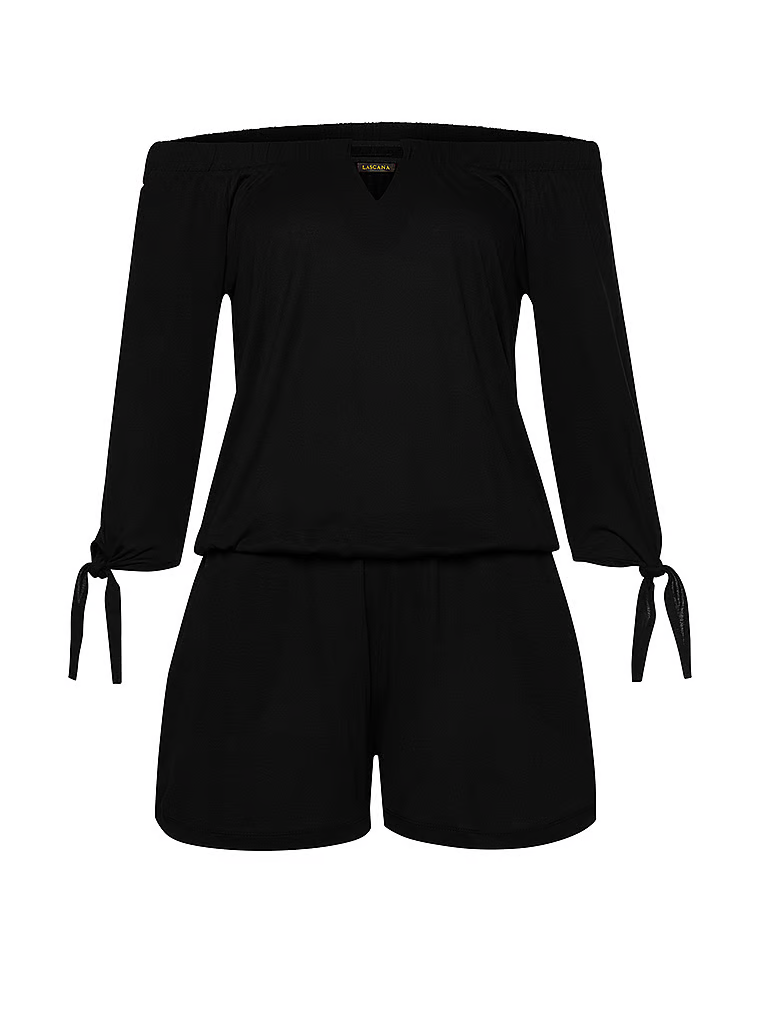 Get dressed in ten seconds flat with an effortlessly chic one-piece featuring an off-the-shoulder neckline and easy shorts to dress up or down.