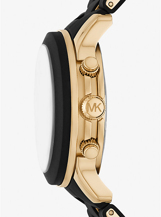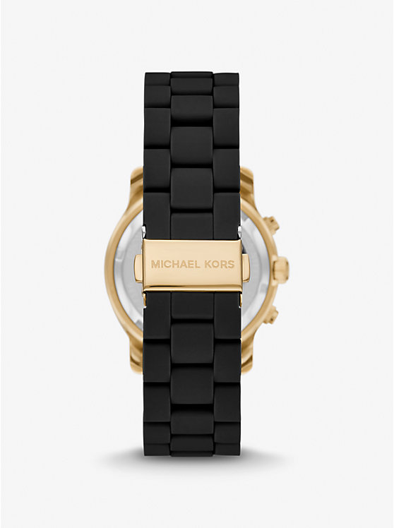 A perennial favorite, our Runway watch is updated with a sunken black dial for a refined, versatile finish. This ultra-sleek style is crafted from gold-tone stainless steel with a silicone wrapped bracelet strap, and features chronograph details for precise timekeeping.