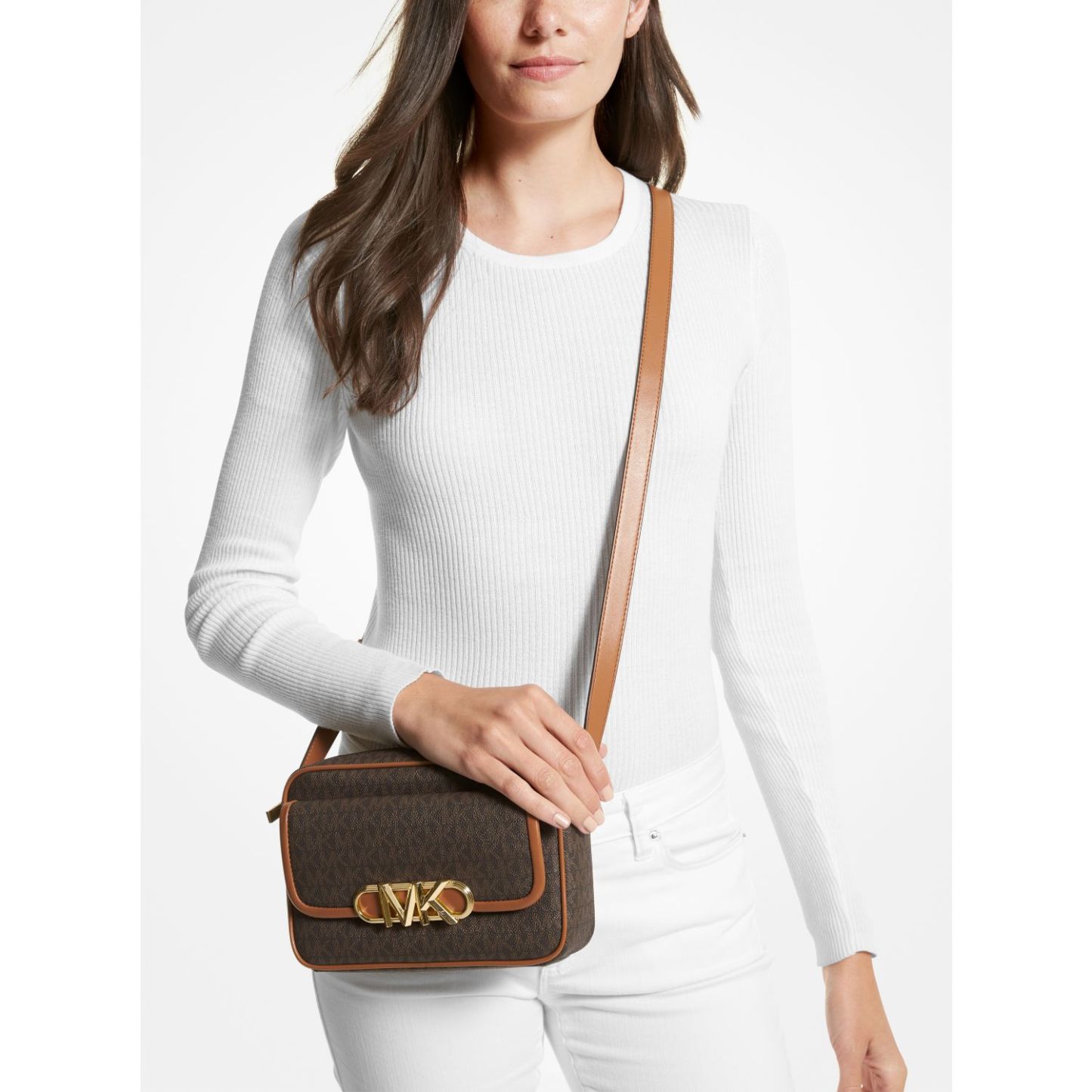 This season’s leather-trimmed Parker crossbody bag is crafted from Signature-print canvas in a sleek silhouette and finished with our new Empire hardware. An array of inside pockets provides practical storage, while an adjustable strap ensures comfortable, hands-free wear from day to dark.
