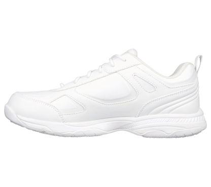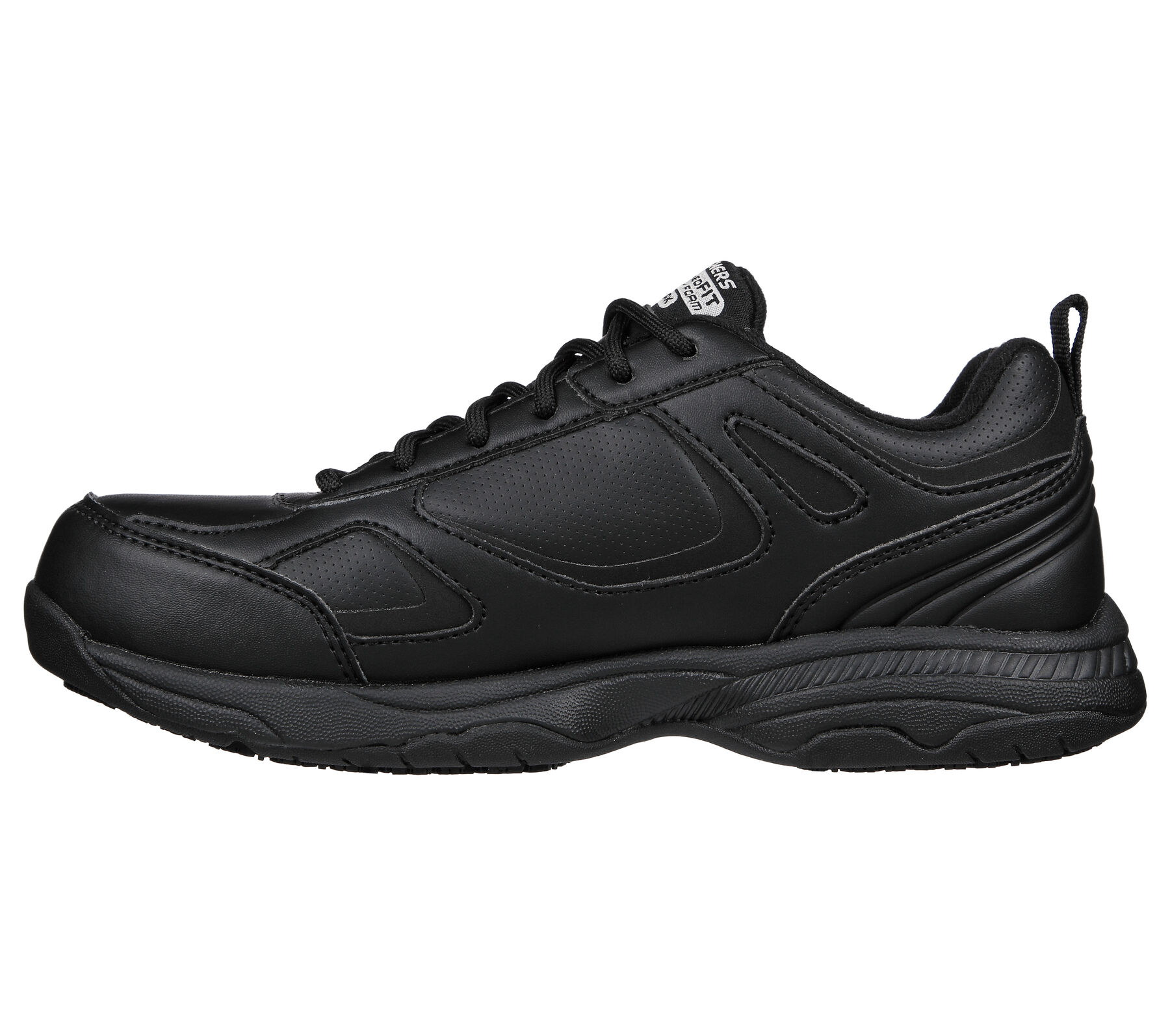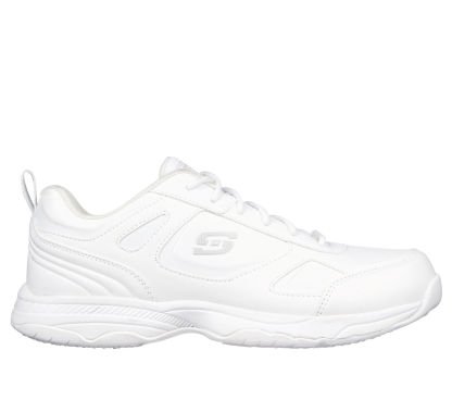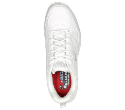 Keep yourself comfortable and safe in Skechers Work Relaxed Fit®: Dighton SR. Smooth leather and synthetic upper on a lace-up sporty casual slip-resistant sneaker with cushioned Memory Foam insole.